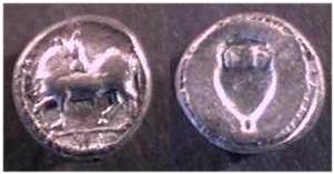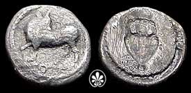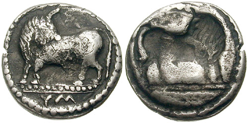 | BMC 9 | Lucania, Sybaris AR third nomos. ca 550-510 BC. YM beneath bull standing left on dotted exergual line, head reverted / Same incuse, no MV. | Text | Image |