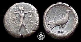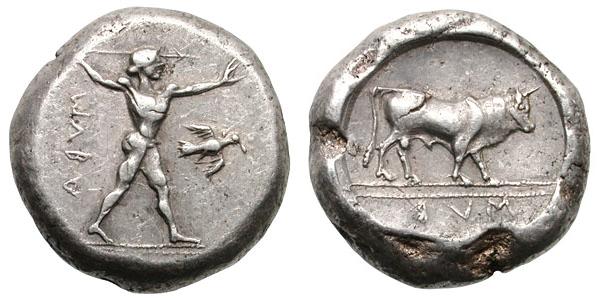 | HN 1743 | Lucania, Sybaris AR Stater. ca 453–448 BC. MVBA (retrograde), Poseidon striding right, brandishing trident above head & extending left arm before him, bird flying right in right field / MVB (retrograde), bull walking right. HN Italy 1743; Kraay, NC 1958, 9. | Text | Image |