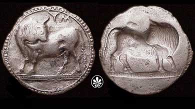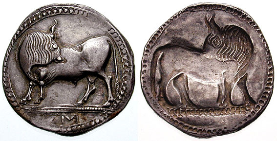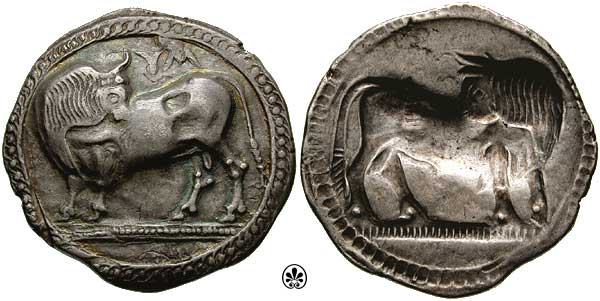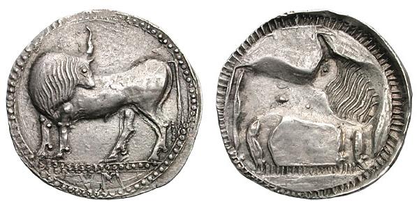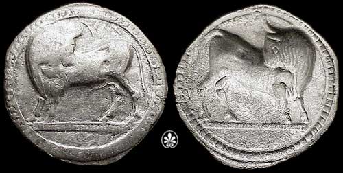 | SNG ANS 841 | Lucania, Sybaris. ca 550-510 BC. AR Nomos. VM in exergue, bull standing left on dotted exergual line, head reverted / Same incuse, no MV. | Text | Image |