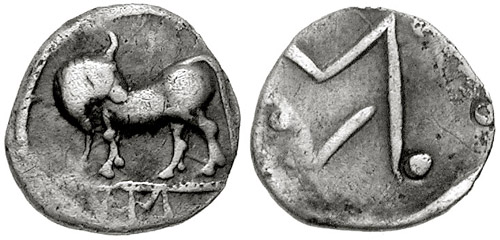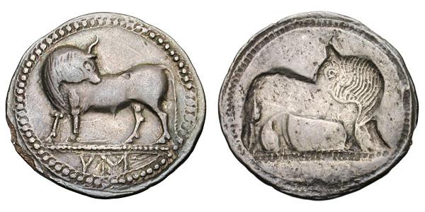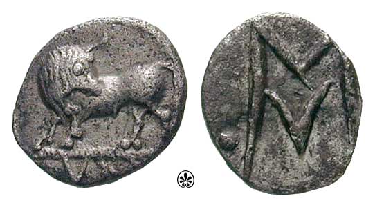 | SNG ANS 854 | Lucania, Sybaris. Circa 530-510 BC. AR Obol (0.40 g). Bull standing left, head reverted; V in exergue / Large MV. | Text | Image | Text | Image |