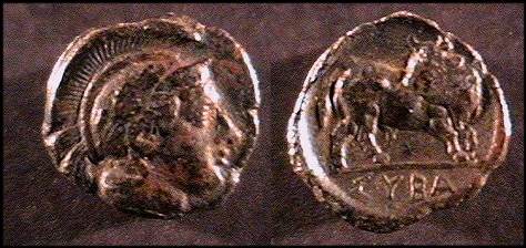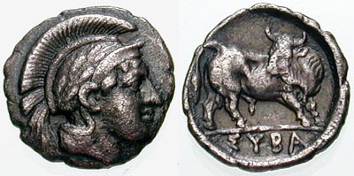| SNG ANS 862 | Sybaris AR 1/6th Stater. c 450 BC. Helmeted head of Athena right / Bull standing right, head turned, ΣYBA in ex. SNG Cop 1403. | Text | Image |