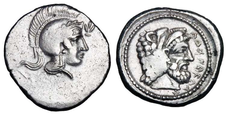 | SNG Cop 26 | Lycian Dynasts, Ddenevele. AR drachm. 420-400 BC, 4.13 g. Bearded male head right, wearing Persian headdress. / DDENEVE (in Lycian), helmeted head of Athena right. SNG Cop 26; Mueseler, Lykische Münzen VI,73. | Text | Image |