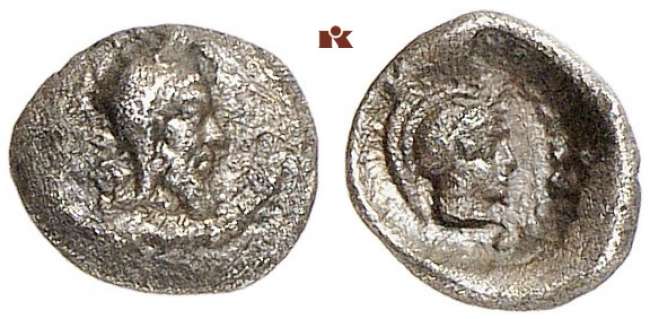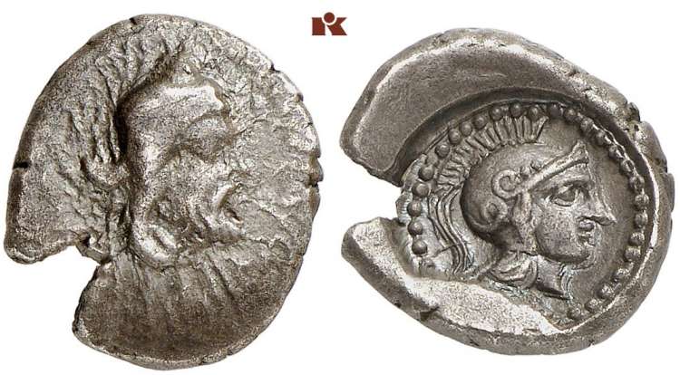 | Traite 9 | Lycia, Dynasts of, Ddenevele AR Obol. Circa 420-400 BC. Head of the Satrap right, in Persian tiara / Helmeted head of Athena right; within incuse circle. Cf. SNG von Aulock 4182 (triobol).
