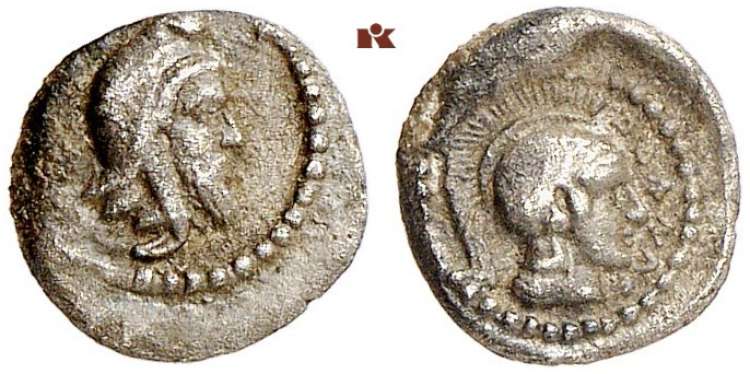| Mueseler VI, 80 | Lycian Dynasts, Ddenevele AR Obol. 410-400 BC, 0.27 g. Struck in Xanthos oder Tlos. Bearded male head right, wearing Persian headdress. / Lycian script to right, helmeted head of Athena right. Winzer 24.6 (this coin); Mueseler VI, 80 (this coin); Traité II-2, 411. | Text | Image |