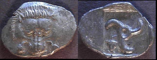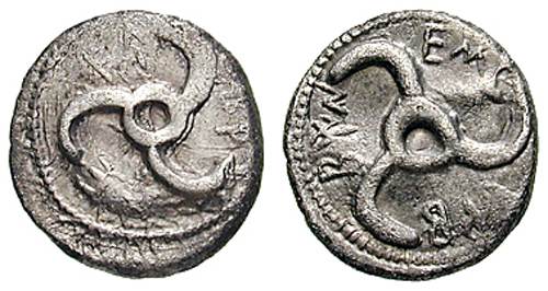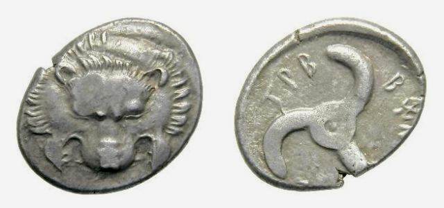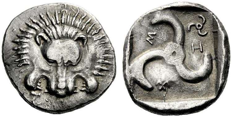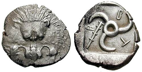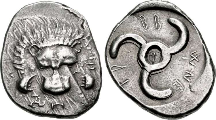 | Morkholm 128 | Lycian Dynasts, Trbbenimi AR Stater. ca 380-370 BC. Facing lion's scalp; [T] below / Triskeles; club to right & TPB around; all within incuse square. | Text | Image |