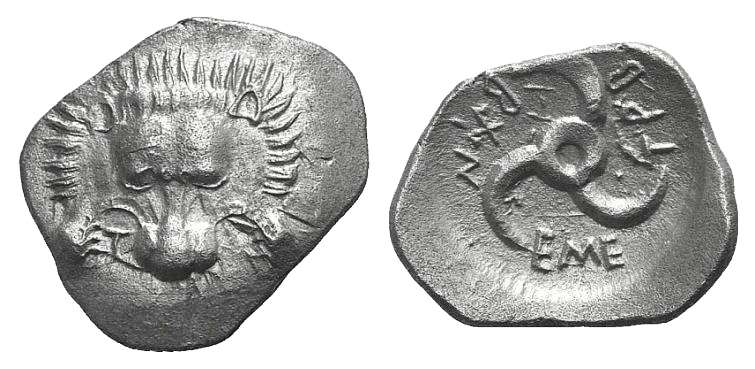 | Morkholm 153 | Lycia, Dynasts of, Trbbenimi AR Third Stater. ca 380-370 BC. Facing lion's scalp; triskeles below / Triskeles; dynast's name around. SNG von Aulock 4218. | Text | Image |