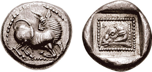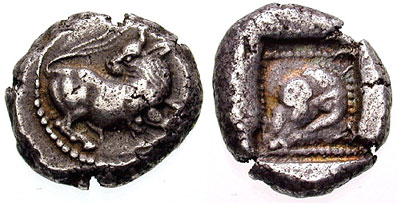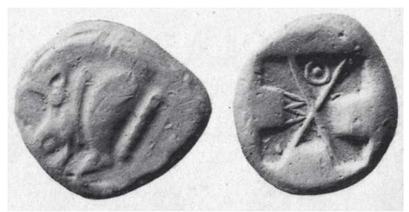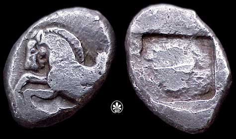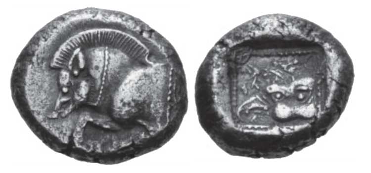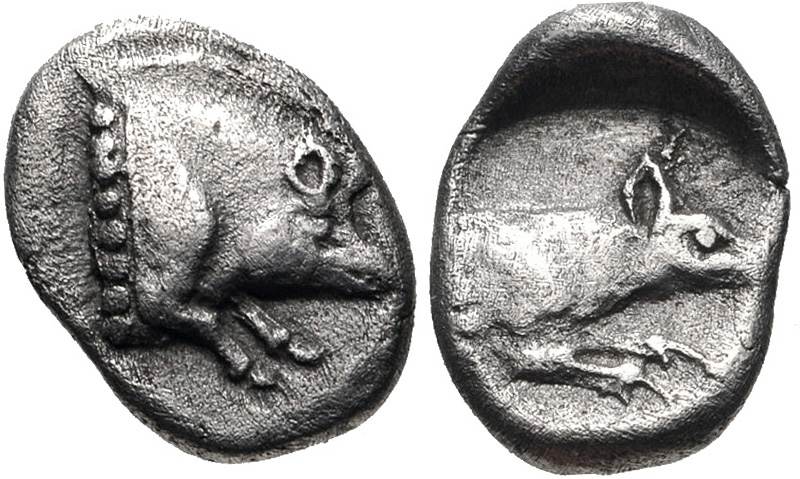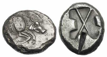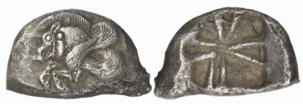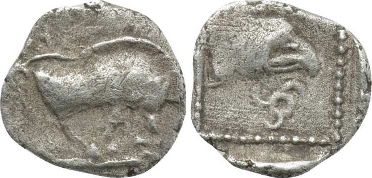 | BMC 5cf | Uncertain Lycian Dynast AR Stater. ca 520-480 BC. Forepart of boar left, both forelegs shown, truncation as dots in parallel lines. / Incuse, cross-shaped punch. | Text | Image |