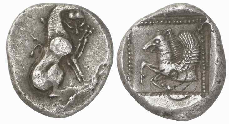 | SNG vA 4082 | Uncertain Lycian Dynast. Circa 480-460 BC. AR Stater. Forepart of Pegasos left / Lion's scalp within incuse square. | Text | Image |