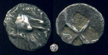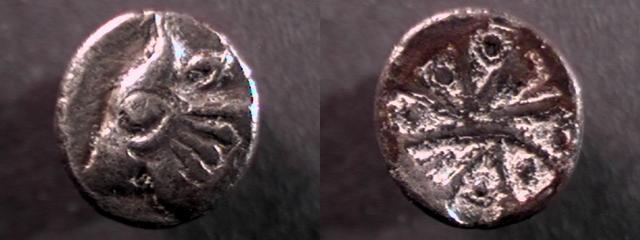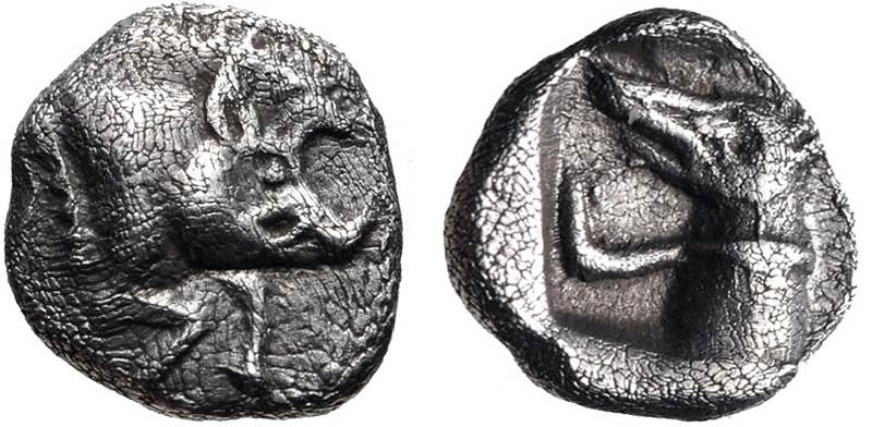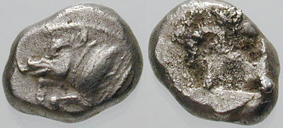 | Rosen 374 | Uncertain Lycian Dynast, AR fraction, (0.43g) c. 500 BC, Boar’s head left. / Incuse square divided into four parts. | Text | Image |