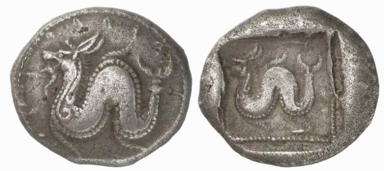 | Rosen 708 | Uncertain Lycian Dynast AR stater, ca. 500-440 BC. 9.30g. Bearded sea-serpent left. / Bearded sea-serpent left in a dotted square border within an incuse square. Rosen 708 (this coin). | Text | Image |