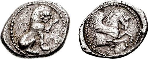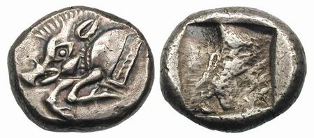 | SNG vA 8467 | Uncertain Lycian Dynast AR stater, ca. 500-440 BC. 9.30g. Sphinx sitting left, right foreleg raised. / Crab within incuse. SNG von Aulock 8467; Prospero XIII, 567. | Text | Image |