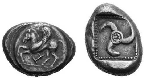 | KhinakhaSNG vA 4087 | Khinakha, Dynast of Lycia, 480-460 BC. AR stater. 9.72 g. Pegasos with curled wing, leaping left on raised shield, Lycian character resembling (angled) rI below. / Triskeles left with circle of dots with central dot in centre, all in dotted square in incuse. SNG von Aulock 4087; SNG Berry 1171. | Text | Image |
