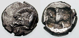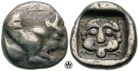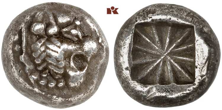 | Mueseler I, 4 | Lycia, uncertain dynast, AR stater, ca 500 BC. 8.98 g. Head of roaring lion left, with a "collar" comprising of dots in circles behind head. / Incuse square divided by lines into eight sections. Mueseler I, 4 (this coin). | Text | Image |