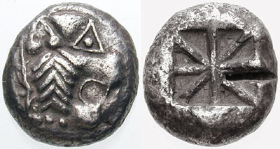 | SNG vA 4041 | Lycia, uncertain dynast, AR stater, ca 500 BC. 8.98 g. Head of roaring lion right. / Incuse divided into 12 parts like a star. SNG von Aulock 4041 (this coin); Mueseler I, 1 (ditto). | Text | Image |