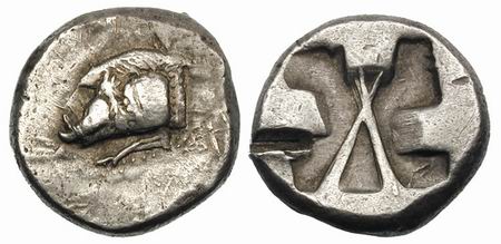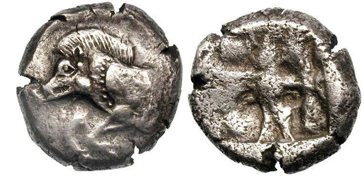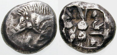 | SNG vA 4046 | Uncertain Lycian Dynast. Circa 500-480 BC. AR Tetrobol. Forepart of boar left / Rough quadripartite incuse punch. | Text | Image | Text | Image |