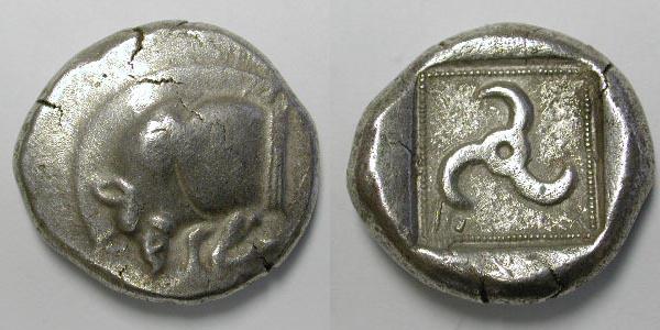 | SNG vA 4059 | Uncertain Lycian Dynast. AR Stater. 500-440 BC. Forepart of boar left / Triskeles left in incuse. | Text | Image |