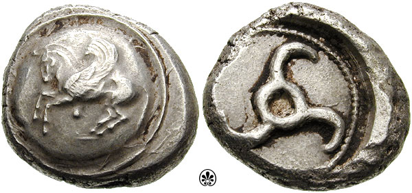 | SNG vA 4089 | Uncertain Lycian Dynast. Circa 500-460 BC. AR Stater. Pegasos flying left on round shield, dot between legs. / Triskeles right in circle of dots within round incuse. SNG vA 4089; Traite II-2, 225. | Text | Image | Text | Image |