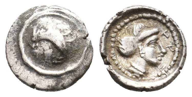 | ArinahaTraite II-2, 399 | Arinaha, Dynast of Lycia. AR obol. 400-380 BC. 10.9 mm, 0.73 g. Shield decorated with a rooster. / Lycian script resembling ARE, head of Aphrodite right, wearing earring and necklace. Traité II-2. 399; Waddington 3001. | Text | Image |