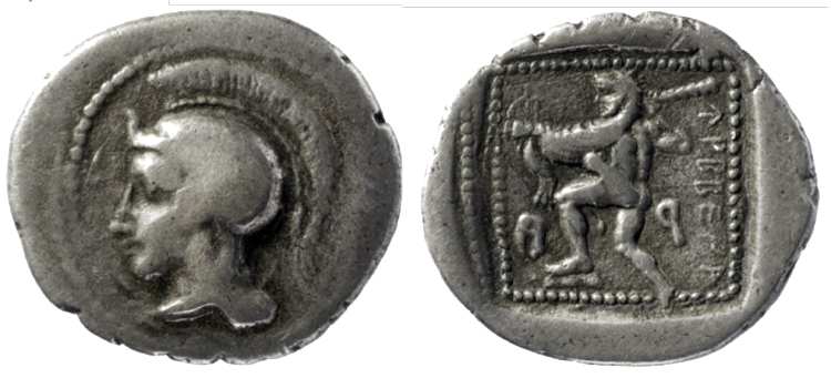 | Erbina Traite II-2, 385 | Erbina, Lycian dynast, AR stater, 420-400 BC. 24 mm, 8.29 g. Helmeted head of Athena left. / Lycian legend resembling Rho;BBENA, Herakles walking left, left foot on rock, wielding club in right hand and holding bow in outstretched left, quiver at his hip. Carian letters resembling epsilon and retrograde Ρ ("it") to left and right. Traite II-2, 385 = Six 229 (this coin); Fellows Lycia pl. VII,5; BMC pl. XLIV, 13. | Text | Image |