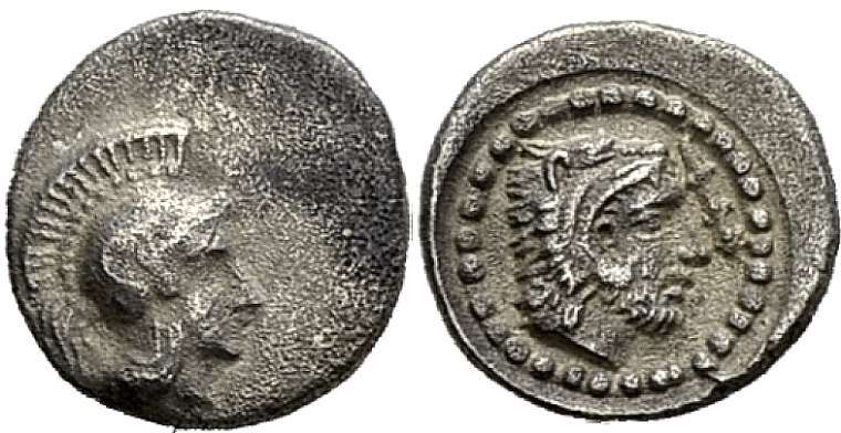 | Traite II-2, 413c | Uncertain Lycian Dynast. AR Obol. 410-400 BC. Probably minted in Telmessos. Helmeted head of Athena right. / Head of Herakles right, wearing lionskin headdress, club before head. Traité II-2, 413c (diobol); Mueseler VI, 62. | Text | Image |
