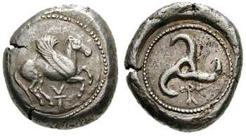 | SNG vA 4090 | Uncertain Lycian Dynast AR Stater. Circa 500-460 BC. Pegasos flying right on round shield; monogram below / Triskeles left, monogram. | Text | Image |