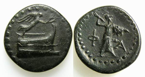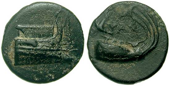 | BMC 10v | Phaselis, Lycia. ca 250-210 BC. AE 11mm. Prow of a galley right / ΦAΣ, stern of a galley right, eagle flying left above left. Heipp-Tamer Phaselis B10 var. Unpublished with stern right. CNG 64, 163. | Text | Image |