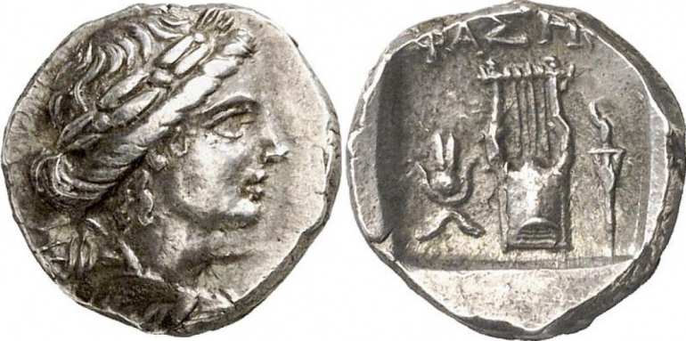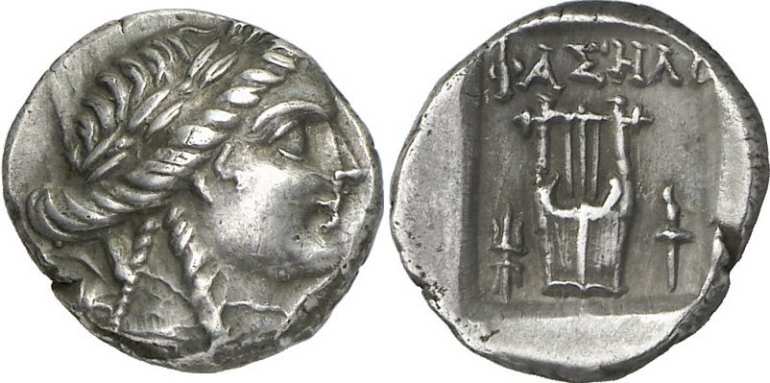 | BMC 17 | Phaselis, Lycia, AR drachm, 2.68 g. 2 C. BC. Laureate head of Apollo right / ΦAΣHΛI, lyre, thunderbolt at lower left, torch at lower right, all within incuse square. Troxell 53; SNG Fitz. 5046; Leake 4; Pembroke Coll. 919; BMC 17; Waddington 3156. | Text | Image |
