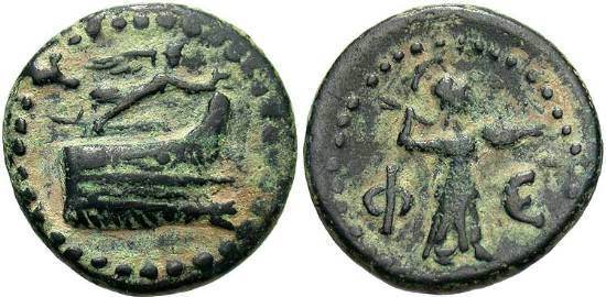 | Heipp-Tamer B56 | Phaselis, Lycia. AE unit. 81-27 BC. 4.00 g. Prow of galley, Nike flying right above / Φ-A, Athena Promachos walking right, wielding spear and holding shield. Heipp-Tamer B56; Walcher 2543; SNG Davis 324. | Text | Image |