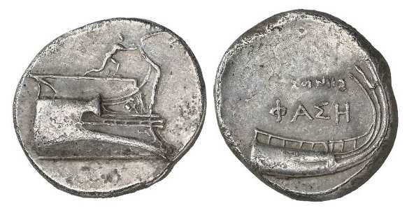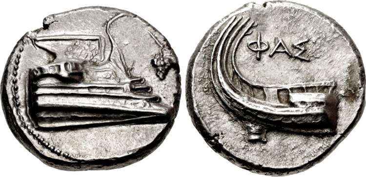 | SNGvA 4393 | Lycia, Phaselis. c500-466 BC. AR Stater. Prow of a galley left in the form of a boar's head / ΦAΣ, stern of galley right in incuse square. | Text | Image |