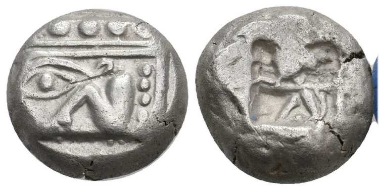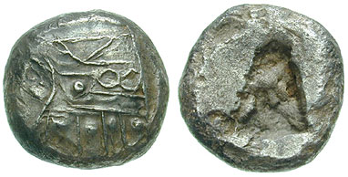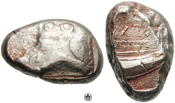 | Kagan 27 | Lycia, Phaselis AR Stater. Circa 530 BC. Prow of galley right, resembling the forepart of a boar; shields visible along gunwhale / Irregular incuse punch. | Text | Image |