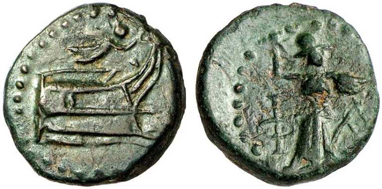 | Sear 5344 | Lycia, Phaselis AE18. Prow right, crowned by Nike flying above / Φ-B, Athena walking right, wielding thunderbolt, aegis on outstretched arm. Sear 5344; Svoronos Mauromichaelis Coll 134. | Text | Image |