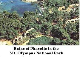 Phaselis, in the Bey Mountains Olympus National Park, 16 km west of Kemer. Visitors can see aquaducts, agoras, baths, theatres, a necropolis, an acropolis and a museum in the city.