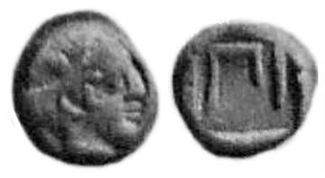 | Rhousopoulos 4237 | Pinara, Lycia, AR hemiobol, 400-380 BC. 6 mm, 0.26 g. Archaic, female head right, hair in a sphendone. / Π in square incuse. Rhousopoulos 4237 (this coin). | Text | Image |