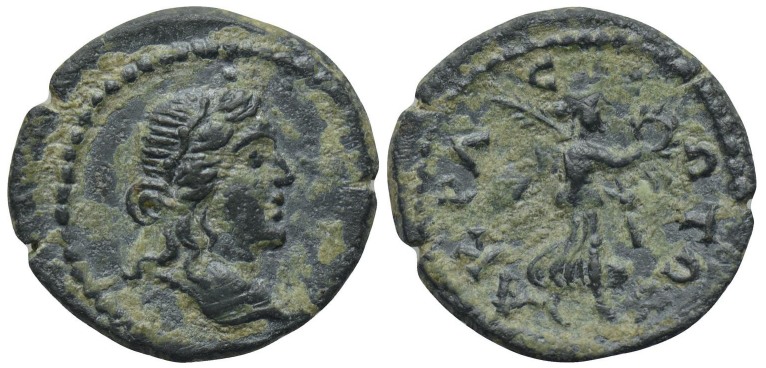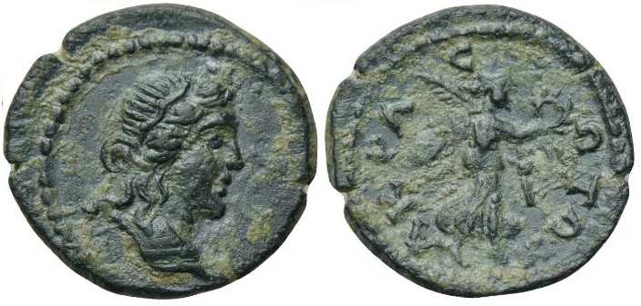 | Vienna 8773 | Crispina, AE 16.6 mm, 3.25 gr of Acrasus, Lydia. AD 178-180. KΡICΠIN AYΓOYCT-A, draped bust right. / AKΡACIΩTΩN, Tyche standing left, kalathos on head, holding rudder and cornucopiae. Winsemann 1179; Vienna 8773 ("Plautilla"); Mionnet Supp VII, 5 ("Faustina II"); GRPC Lydia 37. | Text |  |