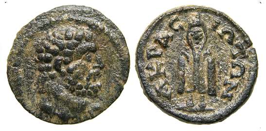 | BMC 22 | Septimius Severus AE20 of Acrasus, Lydia. AY KA Λ C CEOYHΡOC, laureate head right / AKΡACIΩTΩN, Asklepios standing facing, head left, resting on serpent-entwined staff. BMC 22; SNG Cop 8; Hunter 2; Weber 6777-6778; Leypold II, 872.1; GRPC Lydia 62. | Text |  |