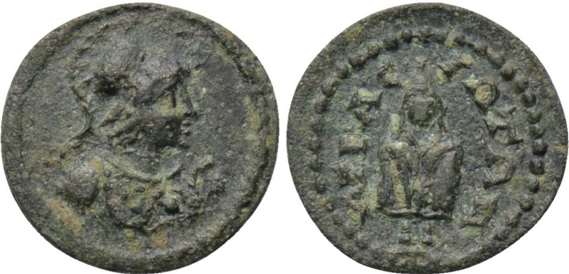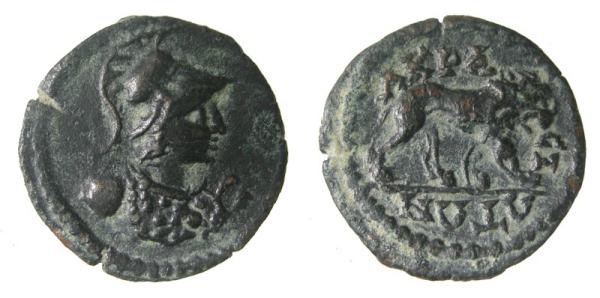 | BMC 14 | Acrasus, Lydia, AE14 semi-autonomous issue, AD 193-211. 1.30g. helmeted bust of Athena right, wearing aegis / AKΡACIΩTΩN, lion walking right. BMC 14; SNG Cop 2; SNG Tuebingen 3657-3658; Weber 6775; Walcher Coll. 2647; Waddington 4848; SNG Munich 17; Mionnet IV, 5; GRPC Lydia 1. | Text |  |