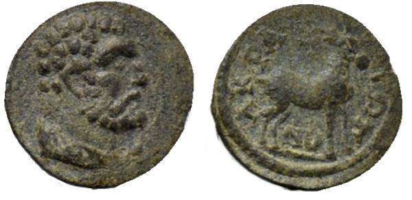| BMC 16 | Septimius Severus, AE of Acrasus, Lydia. 193-211 AD. AYT KAI Λ CEΠT CEOYHΡOC ΠE, laureate, draped bust right / EΠ CTΡA ONHCIΦOΡOY AΠOΛΛ TO B AKΡACIΩTΩN, The traditional group of the Pharnesian Bull: Amphion, Zethos and Dirke, one of the young men tying Dirke to the bull by a rope around his hips, the other holding the humped bull by the horns. BMC 16; GRPC Lydia 48. | Text |  |