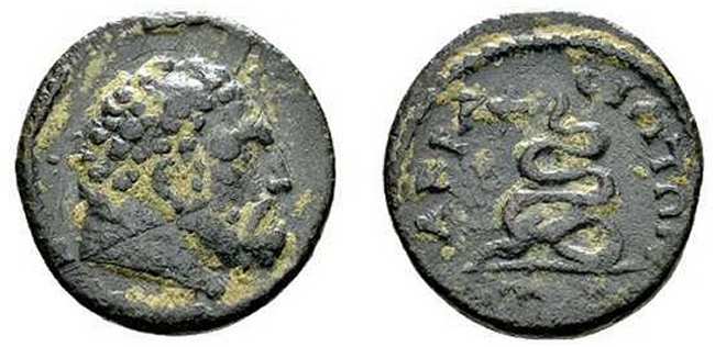 | Kraft 65-14 | Septimius Severus, AE18 of Akrasus, Lydia, AD 193-211. AY KAI CEOYHΡO, laureate head right / AKΡACIΩTΩN, Asklepios standing facing, head left, resting on serpent-entwined staff. Kraft 65.14; Gökyildirim Istanbul 61; GRPC Lydia 64. | Text |  |