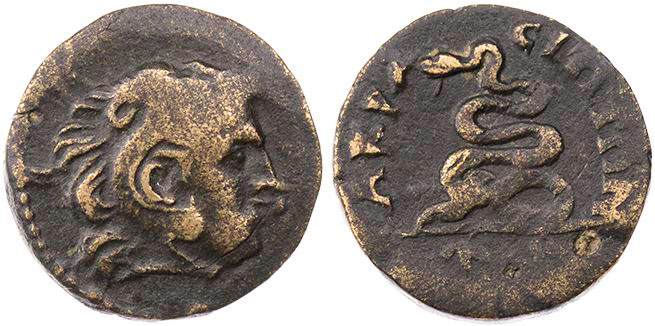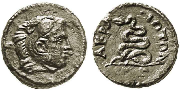 | Mionnet S7, 2 | Acrasus, Lydia, AE16, semi-autonomous, AD 193-211. Youthful head of Herakles right, wearing lionskin headdress / AKΡACIΩTΩN, coiled serpent with raised head, (TΓ? below). Mionnet Supp. VII, 2; Sestini Mus. Fontana I, 2; Paris AA.GR.5077; GRPC Lydia 8. | Text |  |