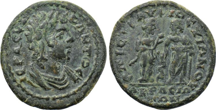 | Mionnet IV, 12 | Septimius Severus, AE32 of Acrasus, Lydia. 193-211. Magistrate Stratoneikianos. AYT KAI Λ CEΠ CEOYHΡOC ΠEΡ. laureate, draped and cuirassed bust right / EΠI CTΡA CTΡATONEIKIANOY T B AKΡACIΩTΩN, Herakles on the left, naked, standing right, resting on club with right hand, left hand outstretched towards Athena, helmeted, standing left, holding spear, shield at her side, left hand outstretched; small burning altar between them. Mionnet IV, 12; Righetti Coll. Sale IV, 706; GRPC Lydia 56. | Text |  |