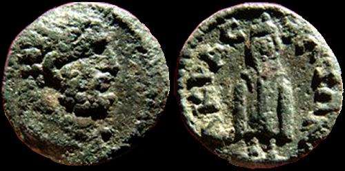 | BMC 5 | Acrasus, Lydia, AE14, semi-autonomous, 193-211 AD. 1.57 gr. Bearded head of Herakles right, lionskin knotted around neck / AKΡACIΩTΩN, Telesphorus standing facing, wearing hooded cloak. BMC 5; SNG Cop 4; SNG Munich 13-14; SNG Turkey 5, 318; Mionnet IV, 2; Paris 3; GRPC Lydia 18. | Text |  |