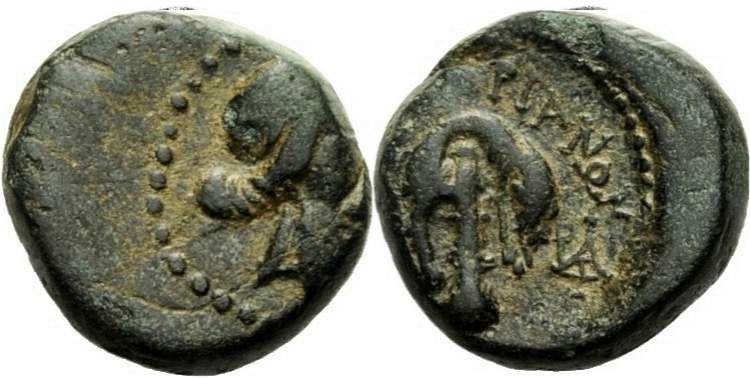 | Imhoof LS 1 | Kaystriani, Lydia, civic issue. AE 13.6 mm, 200-1 BC. 1.95 g. Head of Herakles right, lionskin knotted around neck / KAYCTΡIANΩN, Club (no lionskin). ΡM monogram above, ΠΛY monogram below. Imhoof LS 1; GRPC Lydia 14. | Text | Image |