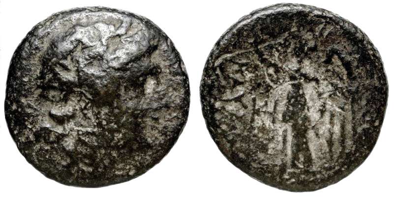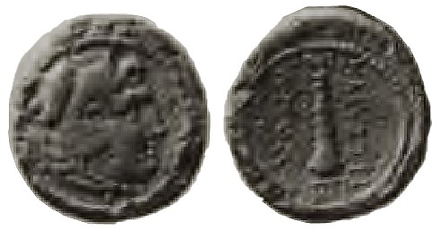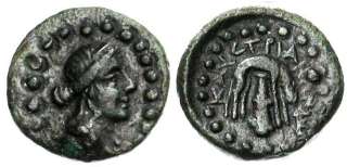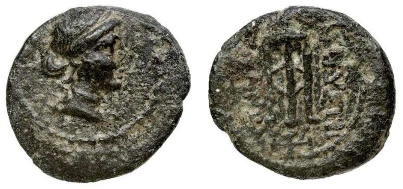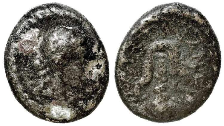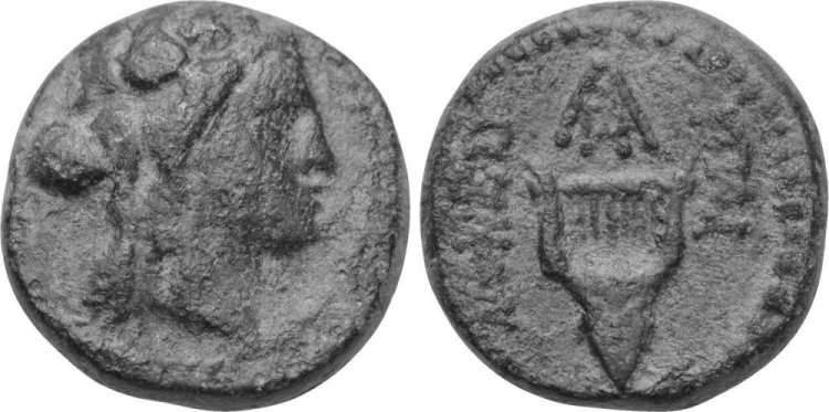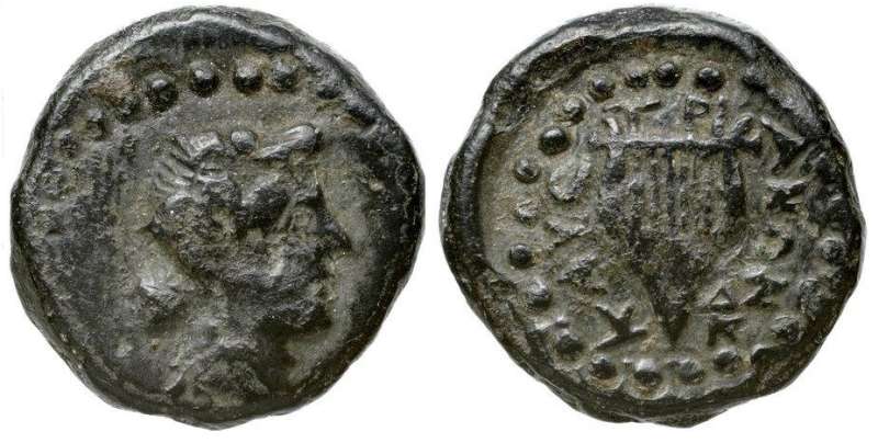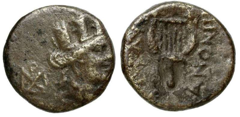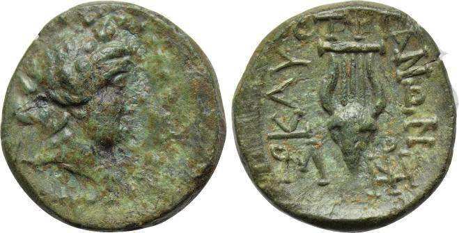 | GRPC Lydia 16 | Kaystriani, Lydia, AE14 autonomous issue. 100-1 BC. Head of Dionysos right, wreathed with ivy. / KAYCTΡIANΩN, lyre formed from a bucranium. AΠΛ monogram above. GRPC Lydia 16, otherwise unpublished. | Text | Image |