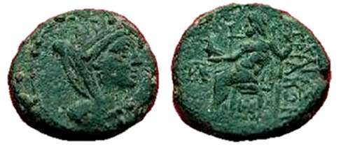 | GRPC Lydia 33 | Kaystriani, Lydia, Autonomous. 200-1 BC. AE 18, 5.58 g. Veiled and turreted bust of Tyche right / KAYΣTΡIANΩN, Zeus seated left on a facing throne, holding eagle and sceptre, ΠA monogram in left field, MI monogram under throne. GRPC Lydia 33, otherwise unpublished. Agora Coins, Feb. 2005. | Text | Image |