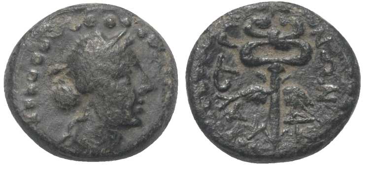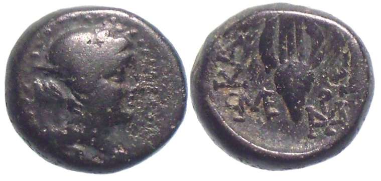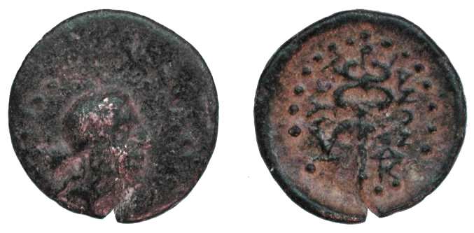 | BMC 9 corr. | Kaystriani, Lydia, AE15, autonomous issue, 200-1 BC. 3.03 g. Head of Dionysos right, wreathed with ivy / KAYCTΡIANΩN, lyre formed from a bucranium, EMΡ monogram in left field, ΡMT monogram in right field. BMC 9 corr. (monogram); SNG Munich 198 corr. (ditto); Plankenhorn 1064; Gökyildirim Istanbul 215; GRPC Lydia 22. | Text | Image |