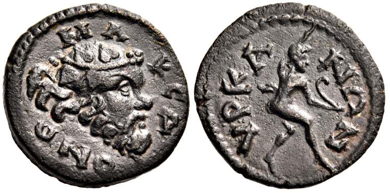 | SNG Fitz 4863 | Hyrkanis, Lydia, AE13, Autonomous. 30 BC-AD 276. Bearded head of Herakles right / YΡKANΩN, lion walking right. SNG Fitzwilliam 4863; Leake 1; GRPC Lydia 8. | Text | Image |