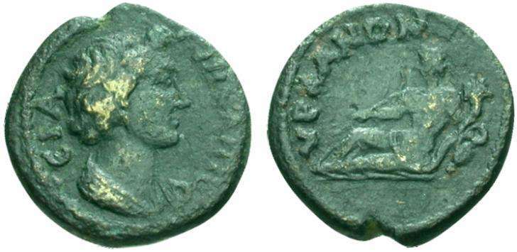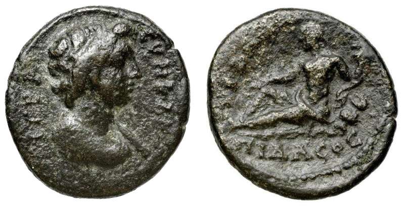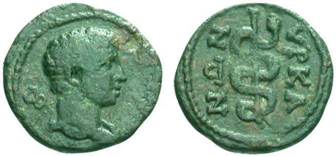 | Waddington 5045 | Faustina II, AE15 of Hyrkanis, Lydia. 146-180. ΦAYCTINA CEBAC, draped bust right / YΡKANΩN, serpent-entwined staff of Asklepios. BMC 16; Waddington 5045; Paris 560; GRPC Lydia 41. | Text | Image |