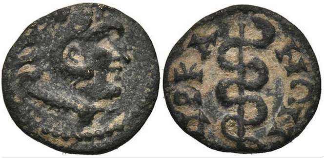 | BMC 5 | Hyrkanis, Lydia, AE13, semi-autonomous issue. 30 BC-AD 276. Head of youthful Herakles right, wearing lionskin / YΡKANΩN, serpent-entwined staff of Asklepios. SNG Cop 206; BMC 5; Winterthur 3749; Leypold I, 1007; Weber (Germany) 3330; GRPC Lydia 10. | Text | Image |
