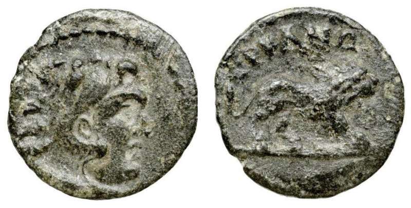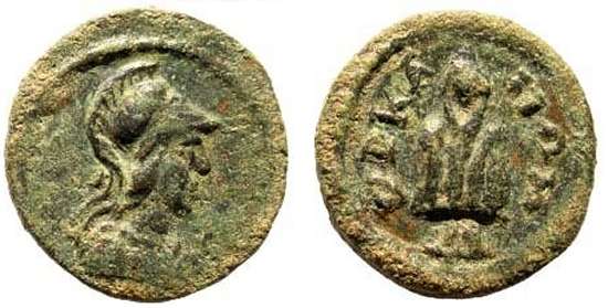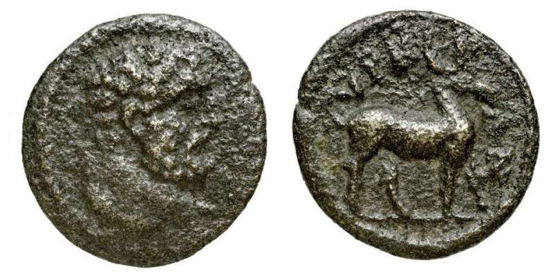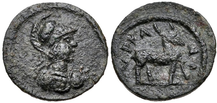 | SNG Cop 207 | Hyrkanis, Lydia, AE14, Autonomous. 30 BC-AD 276. Helmeted head of Athena right, with aegis / YΡKAN, stag standing right. SNG Cop 207 corr; Winterthur 3750; Imhoof KM 1; GRPC Lydia 6. | Text | Image |