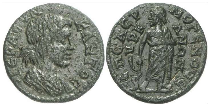 | Imhoof AGM 146 | Marcus Aurelius, AE23 of Hyrkanis, Lydia. 138-161. Magistrates Papianos and Glyconos. M AY OYHΡOC KAICAΡ, bare head right / EΠI ΠAΠIANOY KAI ΓΛYKΩNOC AΡXON YΡKANΩN, Asklepios standing facing, looking left, resting on serpent-entwined staff. Winterthur 3752; Imhoof AGM 146 in RSN 1913; Vossen 11351; GRPC Lydia 39. | Text | Image |